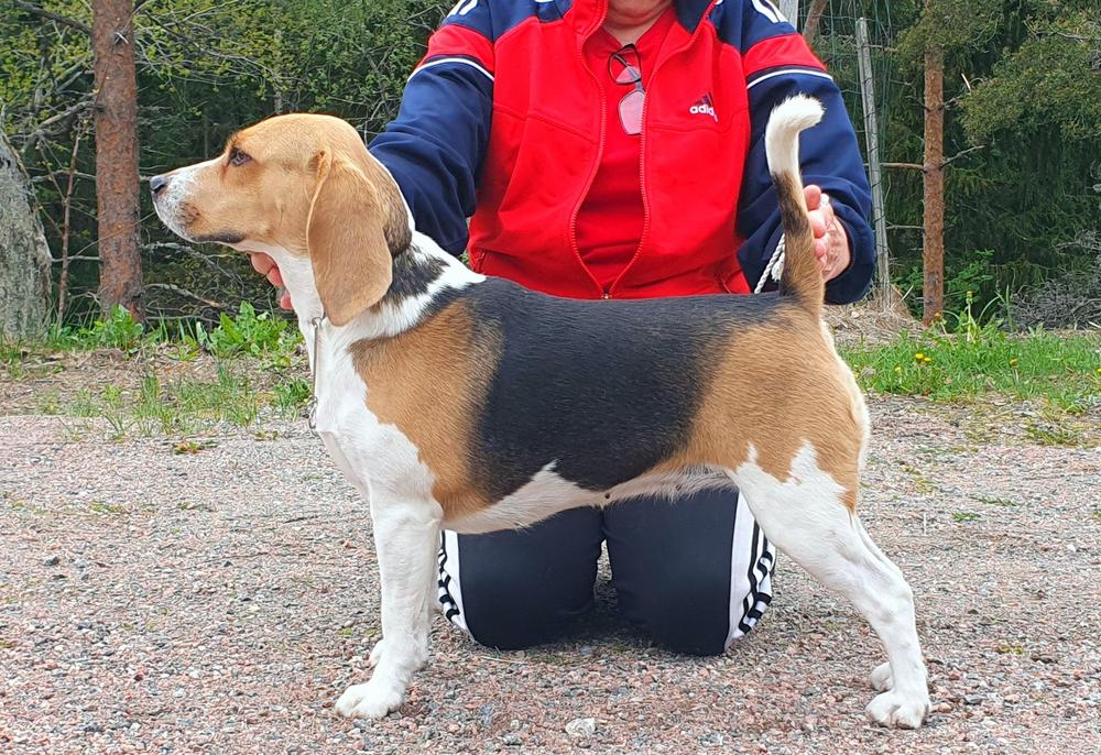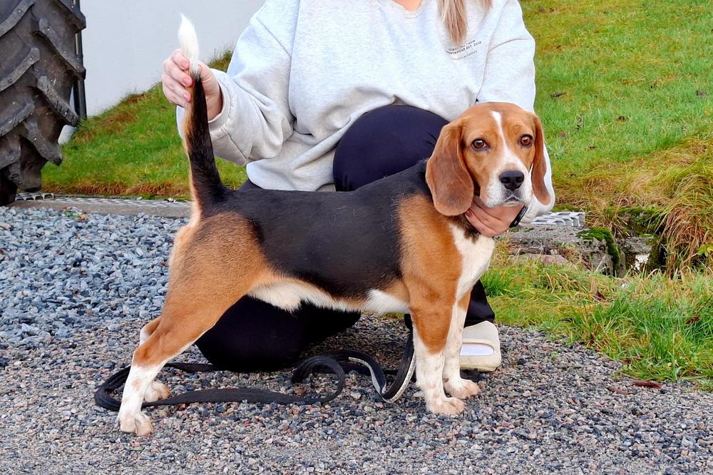 FI UCH Tavajs Dora är en 5-årig tik med utmärkt jaktlusta och hörbart, tätt skall. Hon har 2 1:or på hare.
